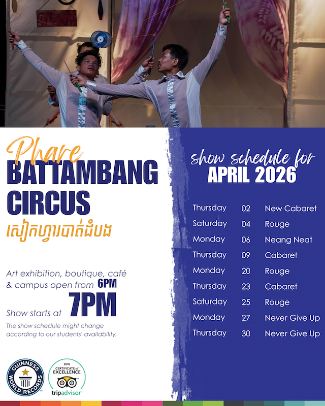 All circus shows are performed by the current students of our Performing Arts School. These young people will later go on to perform at Phare, The Cambodian Circus in Siem Reap or on circus tours with other professional companies around the world (including Cirque du Soleil).